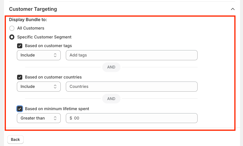 Minimum Lifetime Spend - Display bundles only to customers who’ve spent above or less than a set threshold.