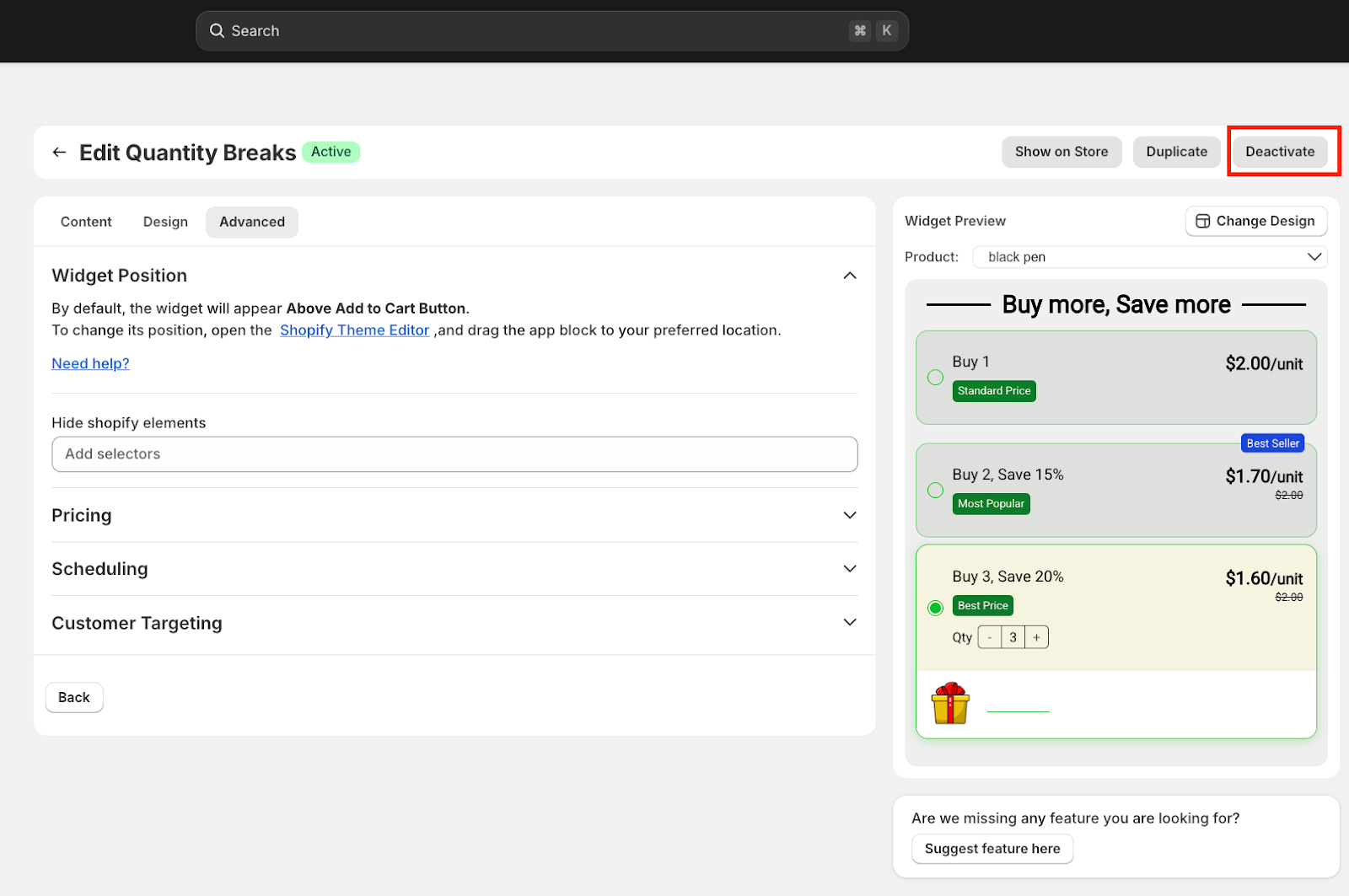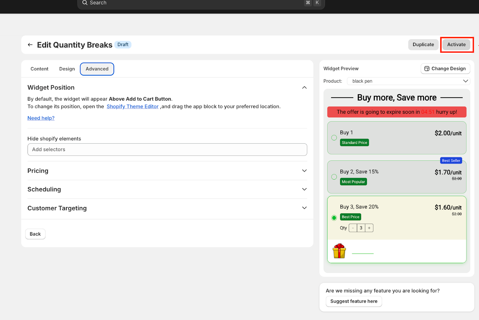 Finally, activate the Quantity Breaks/Volume Discount Bundle by simply clicking on ‘Activate’.