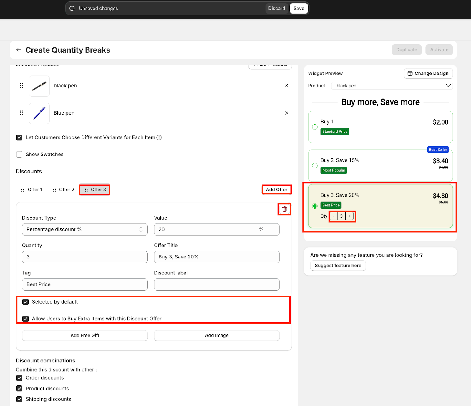 This draws attention to your preferred offer (e.g., “Buy 3, Save 20%”), making it more likely customers will choose it. If unchecked, no offer will be pre-selected and shoppers must actively pick one. -