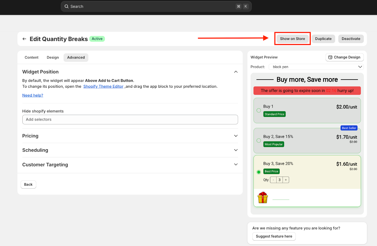 The Widget Preview on the right updates in real time, so you can instantly see how your offers will look to shoppers.