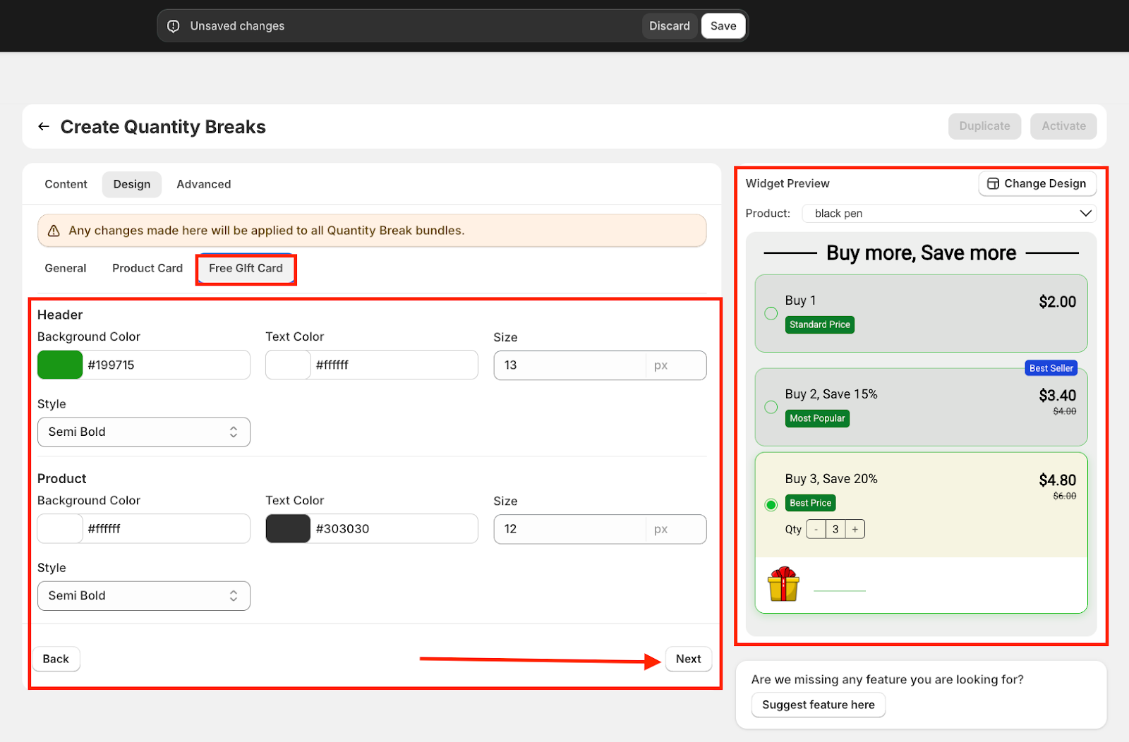 C. Free Gift Card - The Free Gift Card tab lets you customize the look and feel of the free gift section within your Quantity Breaks bundle. This ensures that when a shopper qualifies for a free gift, it’s highlighted in a way that matches your brand style and draws attention.