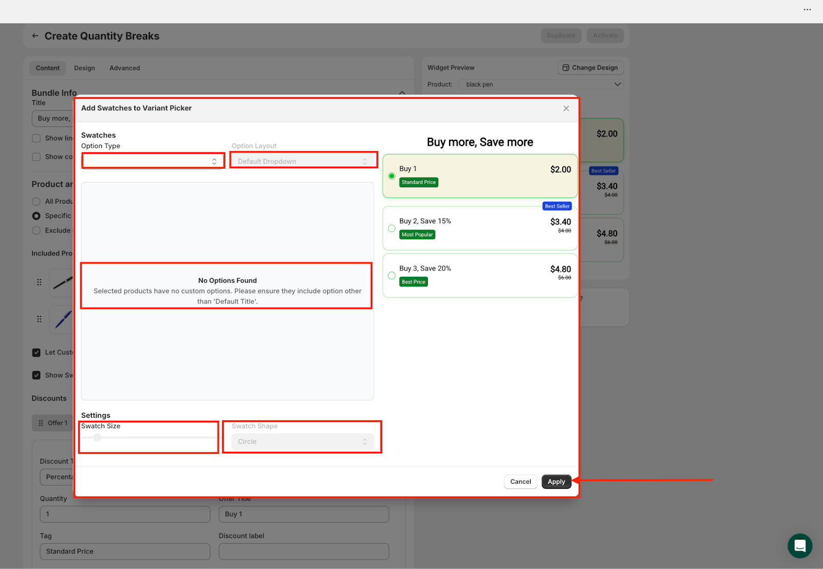 Here’s what happens when you check on Show Swatches and click on ‘Edit Swatch Options’. The panel lets you customize how product variants (like colors or sizes) are displayed in your Quantity Breaks bundle.