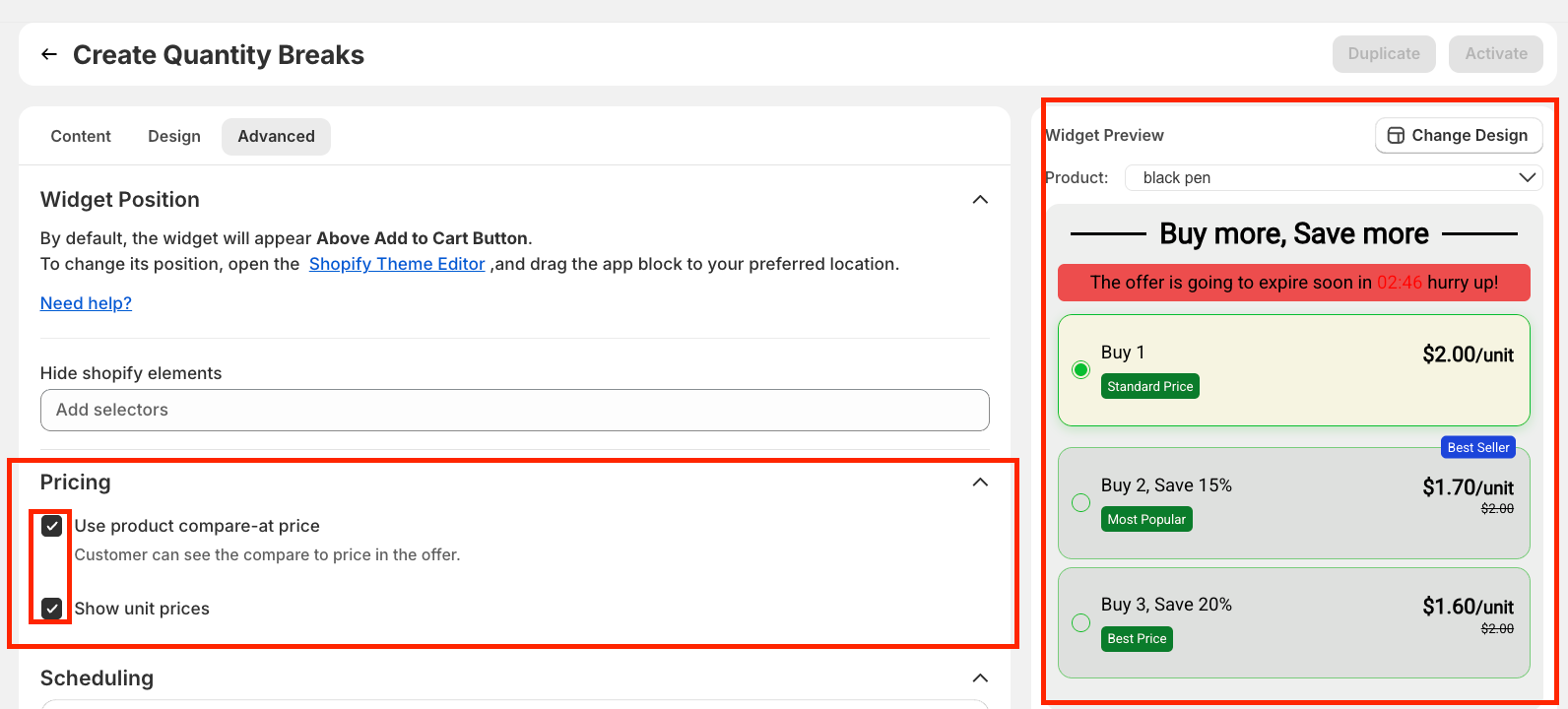 Use product compare-at price (Checkbox): When checked, customers will see the original “compare-at” price alongside the discounted offer, emphasizing savings.