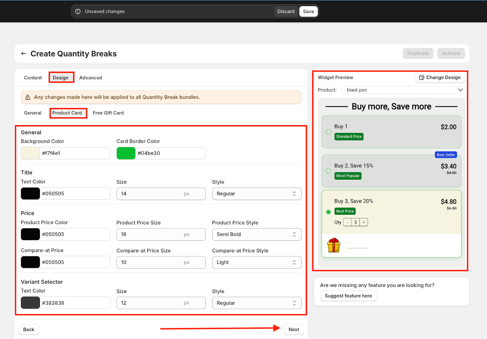 Product Card - The Product Card section in the Design tab allows you to customize how each product card appears within your Quantity Breaks bundle. This ensures your bundle looks polished and aligns with your store’s branding.