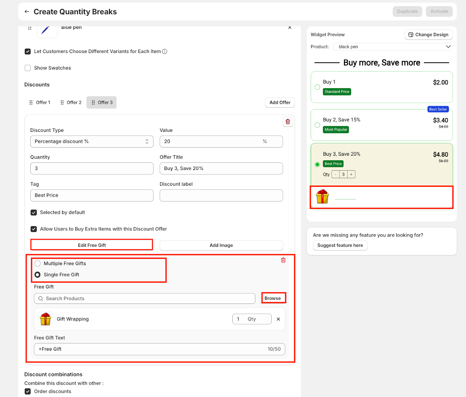 To ‘Add Free Gift’ click on it. This makes the bundle more appealing by giving customers an extra incentive to buy. The free gift will appear directly in the Widget Preview so shoppers can clearly see what they’re getting.