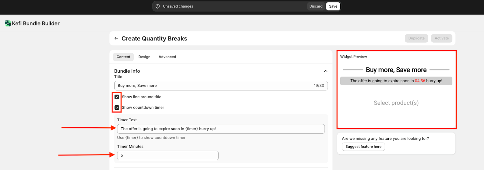 B. Show Countdown Timer – Check this box to add a timer beneath your title, creating urgency and motivating quicker purchases. You can edit the timer text and change the timer minutes as well. Uncheck if you don’t want to display a timer.