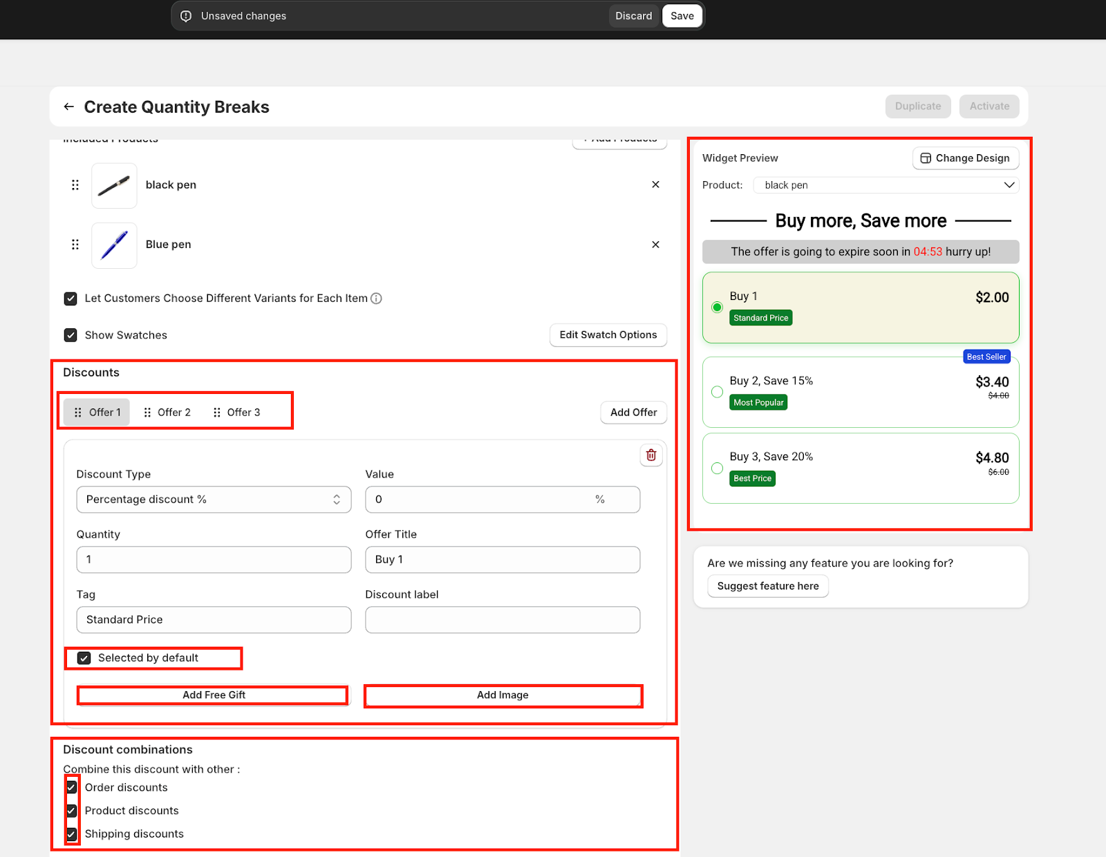 3. Discounts - The Discounts section is where you set up different pricing tiers for your Quantity Breaks bundle. Each Offer represents a tier and you can create multiple offers using the Add Offer button.