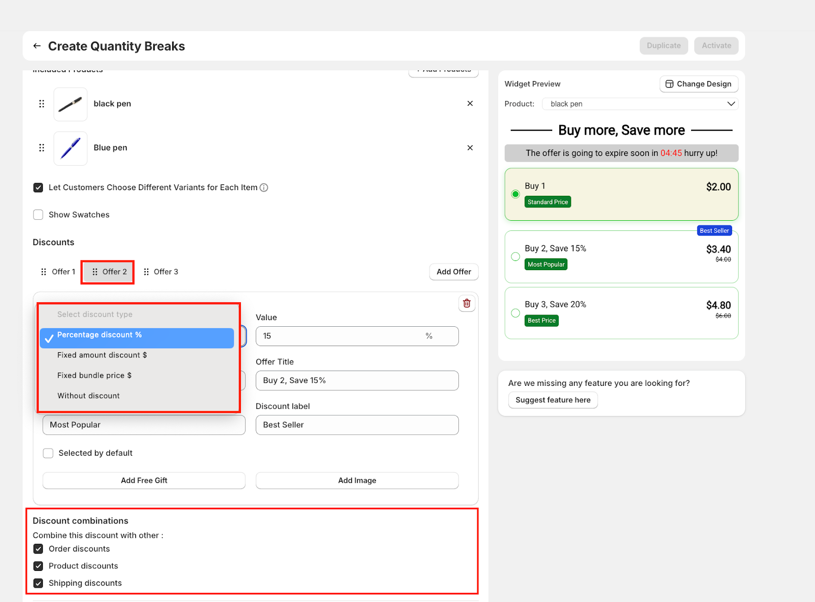 Similarly like Offer 1, you can also switch and add Offer 2. You can either keep the same discount type or choose from the options in the list. You can also modify the discount combinations as per your preference.