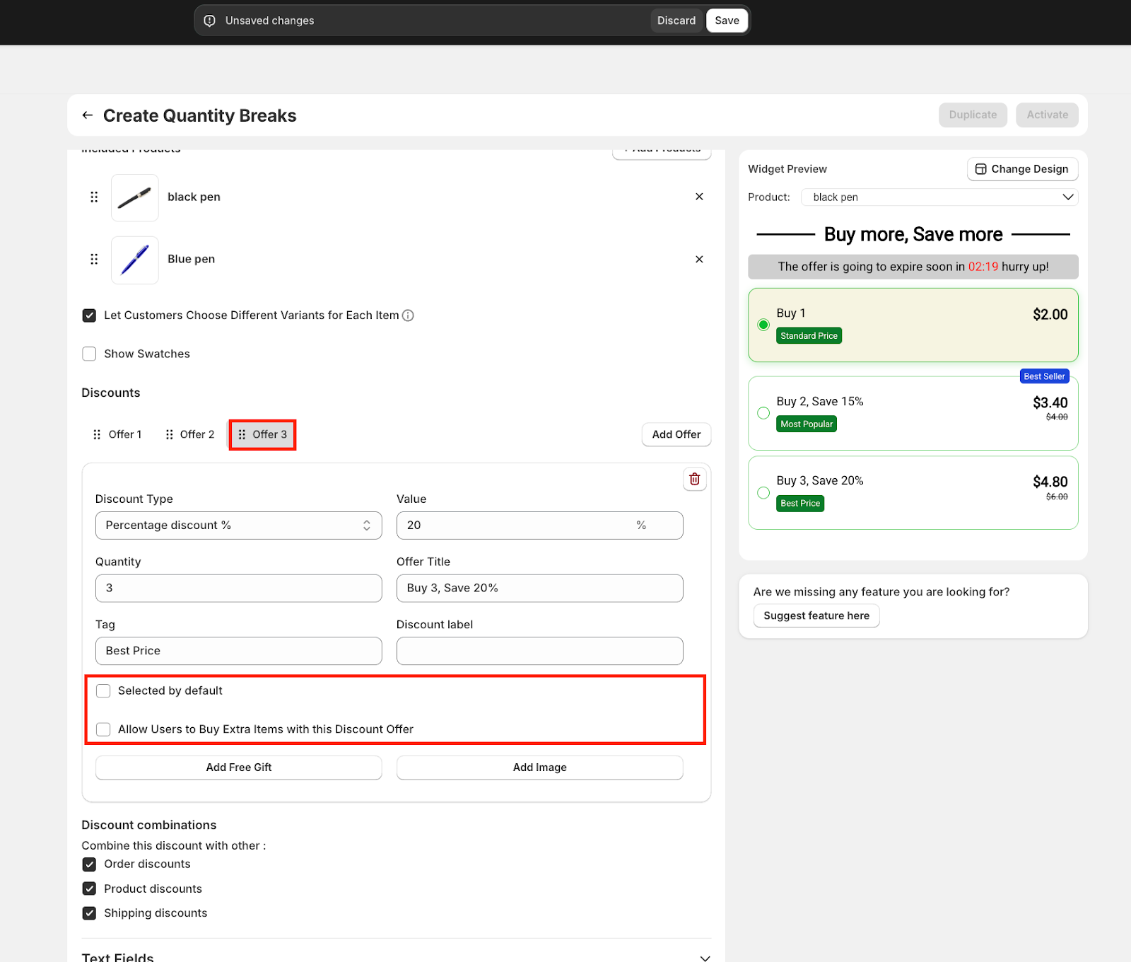 When you switch to Offer 3, you have an extra toggle option. Simply enable it to utilise the feature - “Allow users to buy extra items with the discount offer’’. The rest of the features are the same as Offer 1 and Offer 2.