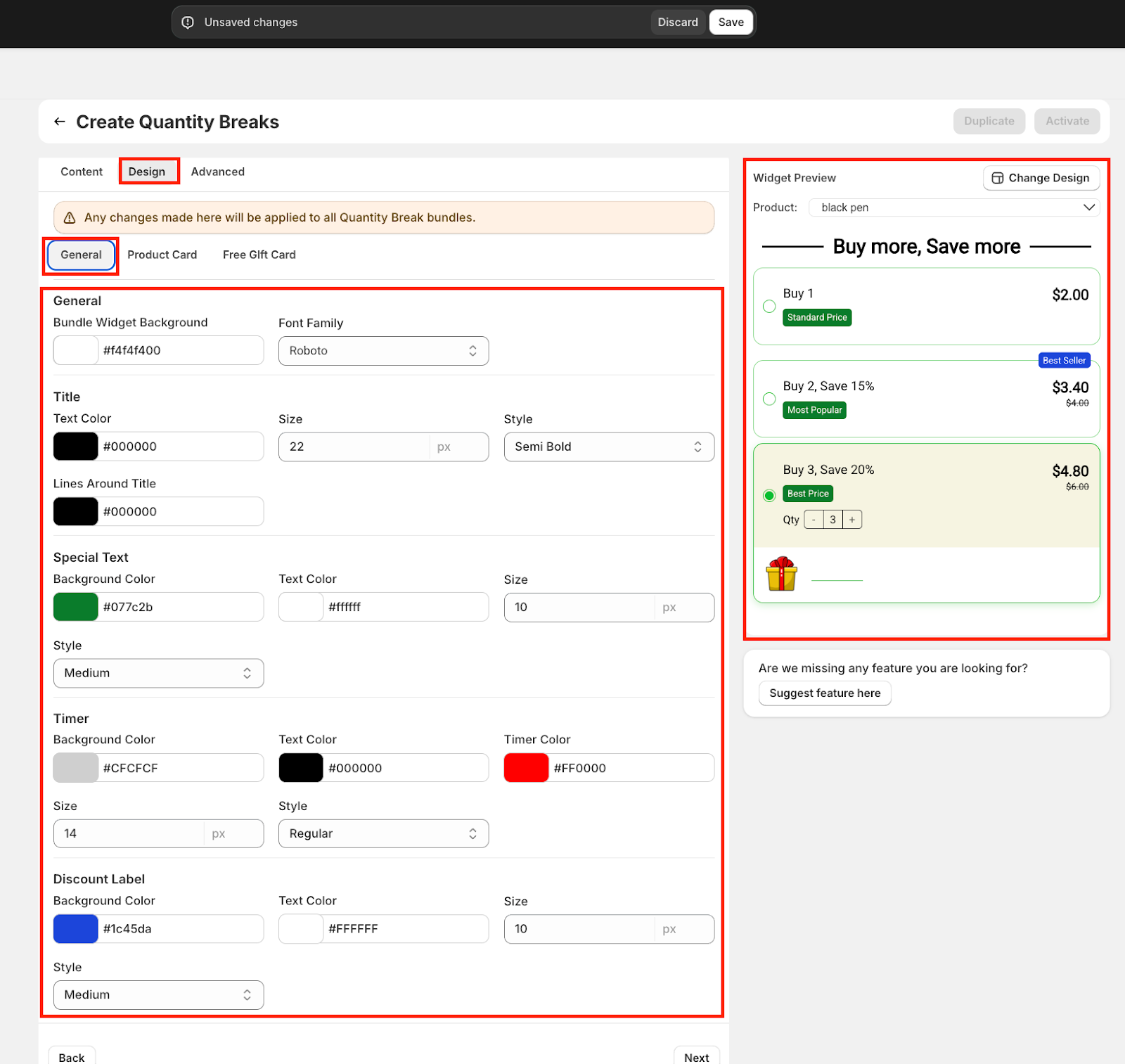 The Design tab lets you control the overall look and feel of your Quantity Breaks bundles so they seamlessly match your store’s branding. Any changes you make here will be applied across all Quantity Breaks bundles.
