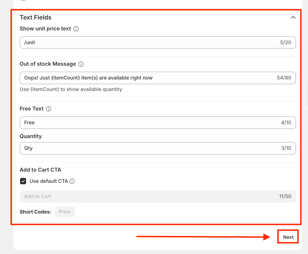 4. Text Field - This section allows you to customize the text displayed in the bundle widget in your preferred language. You can modify labels and messages to better align with your store’s tone and customer base.