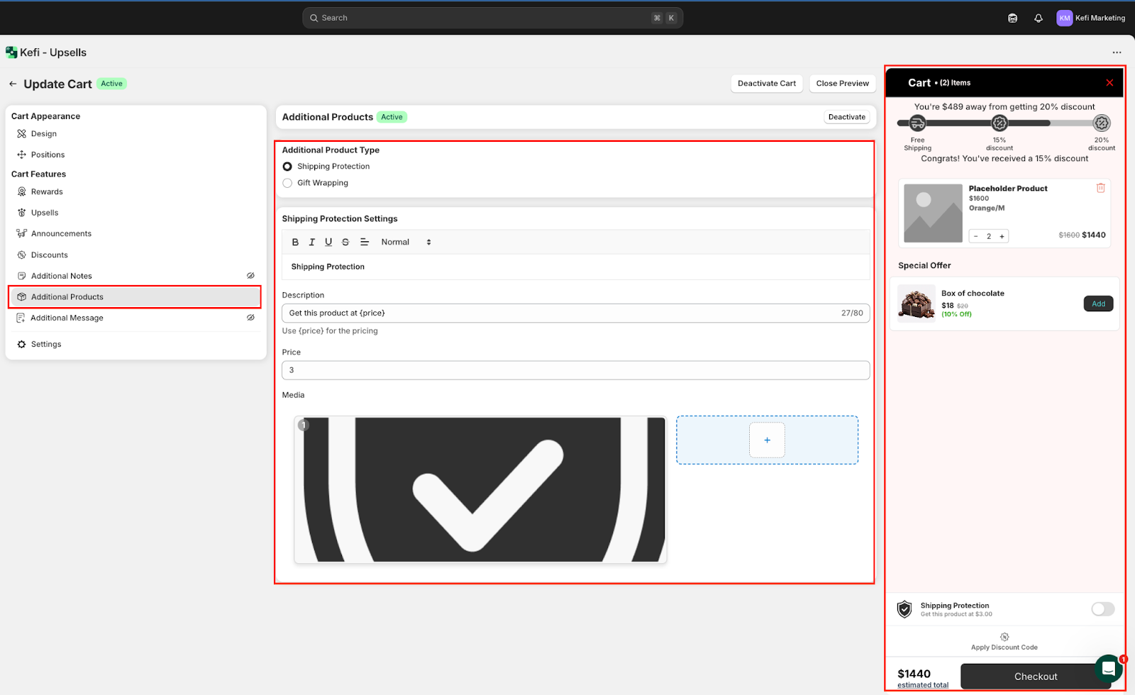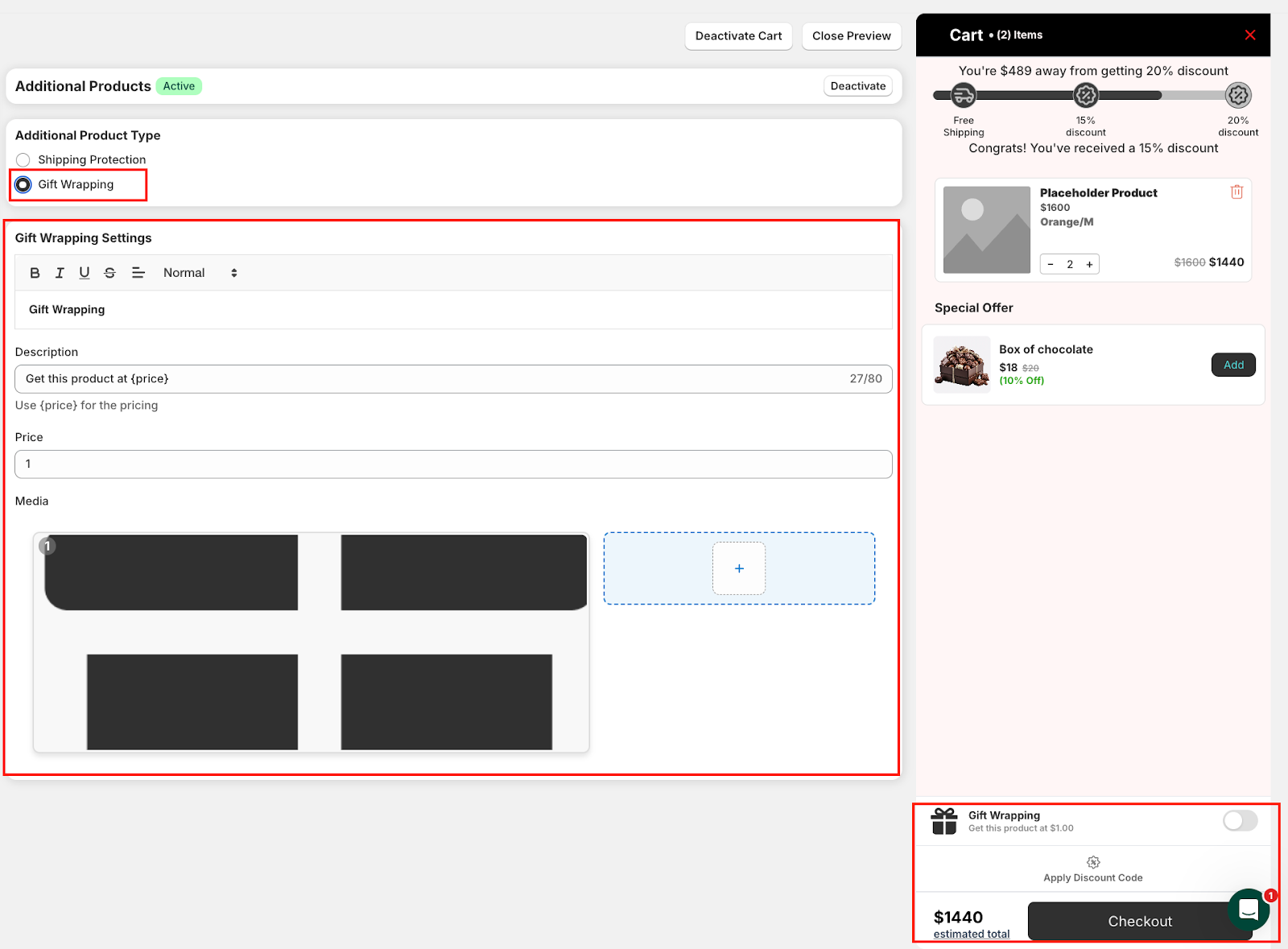 Use the live preview on the right to see how your additional product setup—like Shipping Protection or Gift Wrapping—will appear to customers in real time.