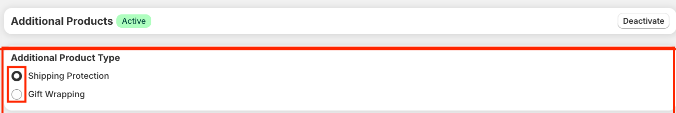 Choose the Additional Product Type - Merchants can choose between offering Shipping Protection or Gift Wrapping as an add-on. Only one option can be active at a time, allowing for focused upselling based on your business needs. Simply toggle between the options to make your pick.