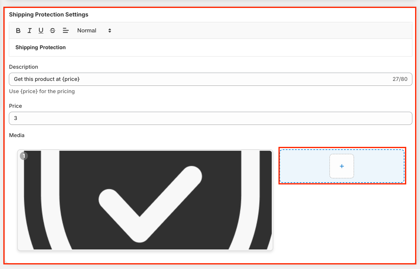 Price - Define the price at which you want to offer the shipping protection. This is the amount the customer will pay to include this add-on in their order.